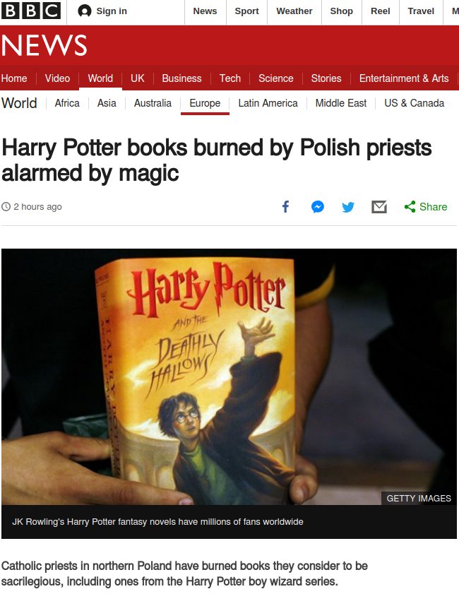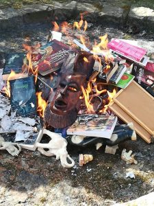 Czas chyba zacząć się przyzwyczajać do nowego oblicza Kościoła Katolickiego w naszym kraju. Na Jasnej Górze naziole z pochodniami, przysięga Młodzieży wszechpolskiej w kościelnym sztafażu, błogosławieństwa dla ONR, bezczelne negowanie przestępstw seksualnych księży, a teraz jeszcze palenie nieprawomyślnych i zakazanych przez kościół książek. W płomieniach wylądowały książki o Harrym Potterze, trochę fantastyki, powieścidła z cyklu Zmierzch, a do towarzystwa dodano jakąś afrykańską maskę ludową, jakieś figurki słoni, a nawet figurkę kota i sowy siedzącej na książce.